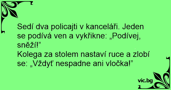 Sedí dva policajti v kanceláři. Jeden se podívá ven a vykřikne: „Podívej, sněží!”
