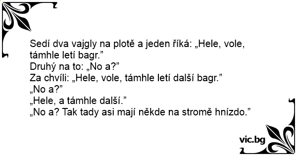 Sedí dva vajgly na plotě a jeden říká: „Hele, vole, támhle letí bagr.”