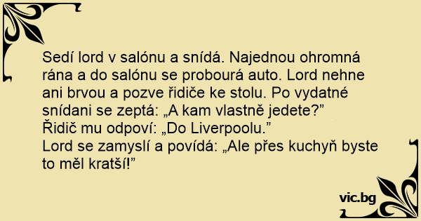Sedí lord v salónu a snídá. Najednou ohromná rána a do salónu se probourá auto. Lord nehne ani brvou a pozve řidiče ke stolu. Po vydatné snídani se zeptá: „A kam vlastně jedete?”