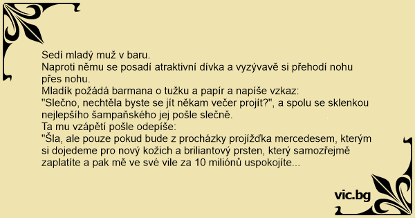"Šla, ale pouze pokud bude z procházky projížďka mercedesem, kterým si dojedeme pro nový kožich a briliantový prsten, který samozřejmě zaplatíte a pak mě ve své vile za 10 miliónů uspokojíte svým 20 cm penisem!"