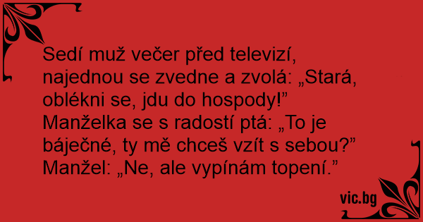 Sedí muž večer před televizí, najednou se zvedne a zvolá: „Stará, oblékni se, jdu do hospody!”