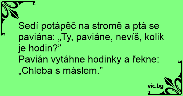 Sedí potápěč na stromě a ptá se paviána: „Ty, paviáne, nevíš, kolik je hodin?”