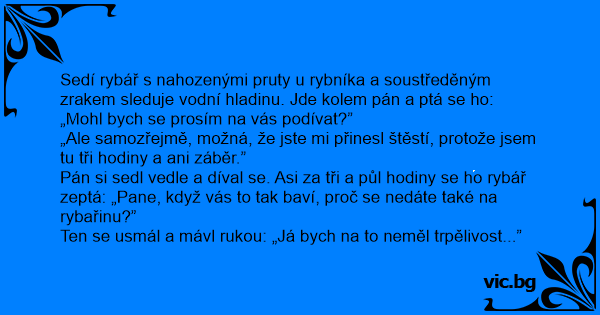 Sedí rybář s nahozenými pruty u rybníka a soustředěným zrakem sleduje vodní hladinu. Jde kolem pán a ptá se hо: „Mohl bych se prosím na vás podívat?”