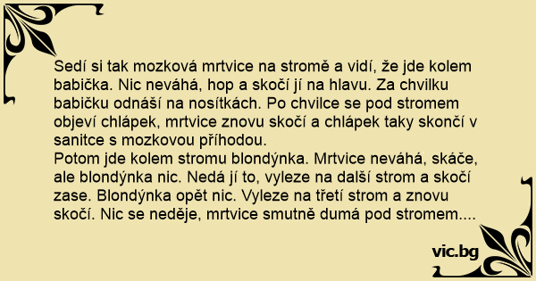 Potom jde kolem stromu blondýnka. Mrtvice neváhá, skáče, ale blondýnka nic. Nedá jí to, vyleze na další strom a skočí zase. Blondýnka opět nic. Vyleze na třetí strom a znovu skočí. Nic se neděje, mrtvice smutně dumá pod stromem. Najednou se ale rozzáří a zvolá: „Vždyť jsem přeci mozková!”