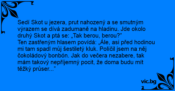 Sedí Skot u jezera, prut nahozený a se smutným výrazem se dívá zadumaně na hladinu. Jde okolo druhý Skot a ptá se: „Tak berou, berou?”