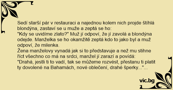 "Kdy se uvidíme zlato?" Muž jí odpoví, že jí zavolá a blondýna odejde. Manželka se hо okamžitě zeptá kdo to jako byl a muž odpoví, že milenka.