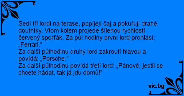 Sedí tři lordi na terase, popíjejí čaj a pokuřují drahé doutníky. Vtom kolem projede šílenou rychlostí červený sporťák. Za půl hodiny první lord prohlásí: „Ferrari.”