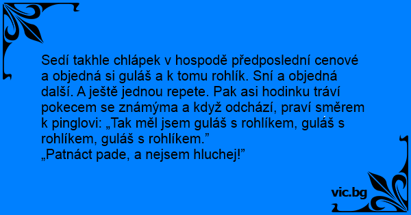 Sedí takhle chlápek v hospodě předposlední cenové a objedná si guláš a k tomu rohlík. Sní a objedná další. A ještě jednou repete. Pak asi hodinku tráví pokecem se známýma a když odchází, praví směrem k pinglovi: „Tak měl jsem guláš s rohlíkem, guláš s rohlíkem, guláš s rohlíkem.”