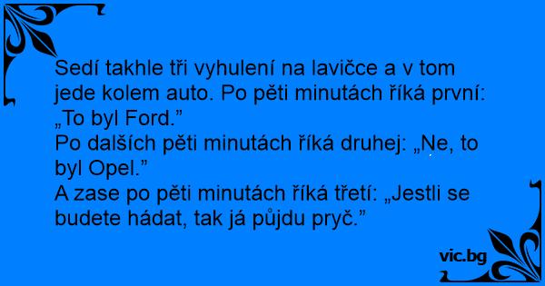 Sedí takhle tři vyhulení na lavičce a v tom jede kolem auto. Po pěti minutách říká první: „To byl Ford.”