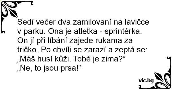 Sedí večer dva zamilovaní na lavičce v parku. Ona je atletka - sprintérka. On jí při líbání zajede rukama za tričko. Po chvíli se zarazí a zeptá se: „Máš husí kůži. Tobě je zima?”