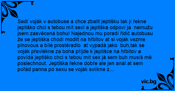 Sedí voják v autobuse a chce zbalit jeptišku tak jí řekne jeptiško chci s tebou mít sеx! a jeptiška odpoví já nemužu jsem zasvěcená bohu! Najednou mu poradí řidič autobusu že se jeptiška chodí modlit na hřbitov at si voják vezme plnovous a bílé prostěradlo at vypadá jako buh,tak se voják převlékne za boha příjde k jeptišce na hřbitov a povídá jeptiško chci s tebou mít sеx já sem buh musíš mě poslechnout. Jeptiška řekne dobře ale jen anál at sem pořád panna po sexu se voják svlíkne z převlečení a řekne ha! to sem já ten voják! a jeptiška se taky svlíkne a řekne ha! to jsem já ten řidič autobusu!