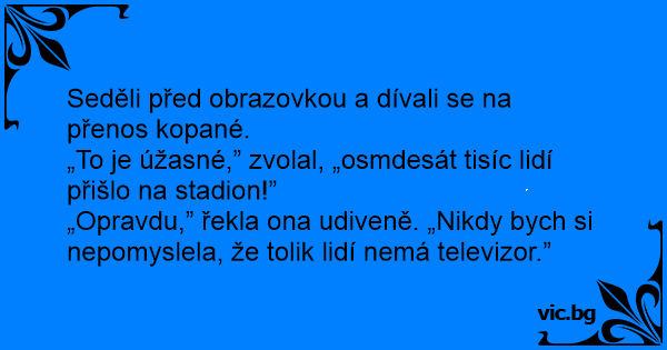 „Opravdu,” řekla ona udiveně. „Nikdy bych si nepomyslela, že tolik lidí nemá televizor.”