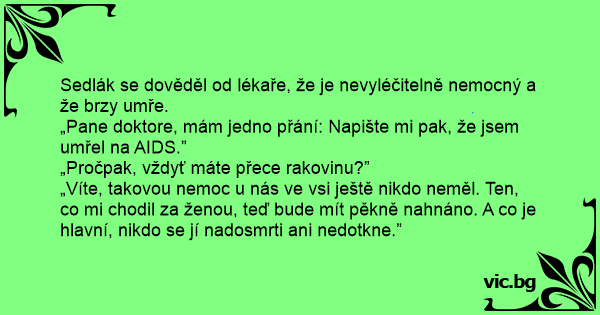 Nuo sezoninio gripo mirštantis žmogelis sako daktarui: - Aš tau atsidėkodamas sumokėsiu jei tu į mano diagnozę įrašysi, kad numiriau nuo AIDS. - Kodėl?! – klausia gydytojas. - Visų pirma – tu...
