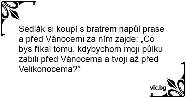 Sedlák si koupí s bratrem napůl prase a před Vánocemi za ním zajde: „Co bys říkal tomu, kdybychom moji půlku zabili před Vánocema a tvoji až před Velikonocema?”