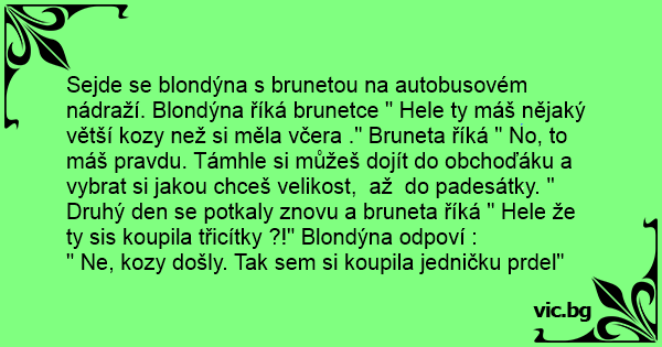 Sejde se blondýna s brunetou na autobusovém nádraží. Blondýna říká brunetce " Hele ty máš nějaký větší kozy než si měla včera ." Bruneta říká " No, to máš pravdu. Támhle si můžeš dojít do obchoďáku a vybrat si jakou chceš velikost, až do padesátky. "