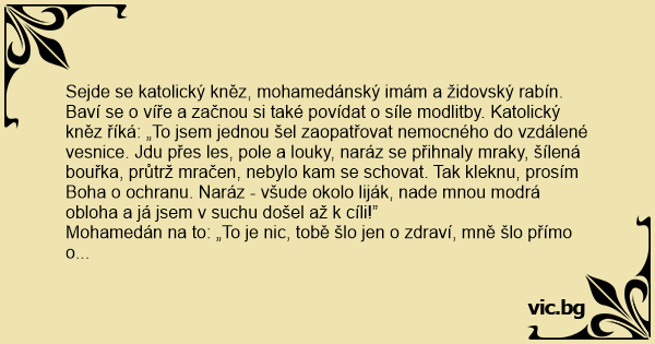 Sejde se katolický kněz, mohamedánský imám a židovský rabín. Baví se o víře a začnou si také povídat o síle modlitby. Katolický kněz říká: „To jsem jednou šel zaopatřovat nemocného do vzdálené vesnice. Jdu přes les, pole a louky, naráz se přihnaly mraky, šílená bouřka, průtrž mračen, nebylo kam se schovat. Tak kleknu, prosím Boha o ochranu. Naráz - všude okolo liják, nade mnou modrá obloha a já jsem v suchu došel až k cíli!”