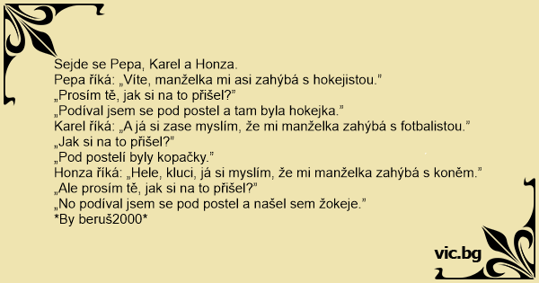 Honza říká: „Hele, kluci, já si myslím, že mi manželka zahýbá s koněm.”