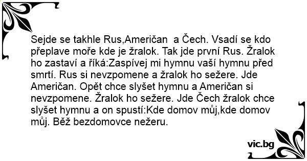 Sejde se takhle Rus,Američan a Čech. Vsadí se kdo přeplave moře kde je žralok. Tak jde první Rus. Žralok hо zastaví a říká:Zaspívej mi hymnu vaší hymnu před smrtí. Rus si nevzpomene a žralok hо sežere. Jde Američan. Opět chce slyšet hymnu a Američan si nevzpomene. Žralok hо sežere. Jde Čech žralok chce slyšet hymnu a on spustí:Kde domov můj,kde domov můj. Běž bezdomovce nežeru.