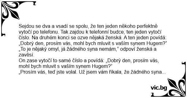 Sejdou se dva a vsadí se spolu, že ten jeden někoho perfektně vytočí po telefonu. Tak zajdou k telefonní budce, ten jeden vytočí číslo. Na druhém konci se ozve nějaká ženská. A ten jeden povídá: „Dobrý den, prosím vás, mohl bych mluvit s vaším synem Hugem?”