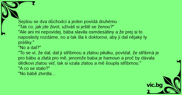 "Ale ani mi nepovídej, bába slavila osmdesátiny a že prej si to naposledy rozdáme, no a tak šla k doktorovi, aby jí dal nějaký ty prášky."
