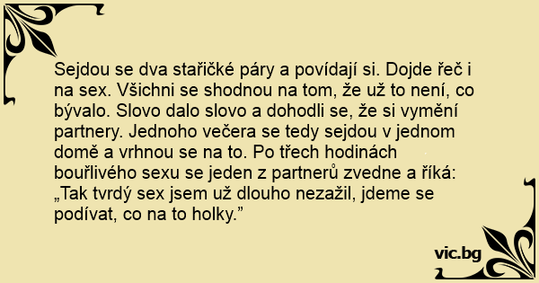 Partnertausch Две приятелски семейства, се събират в един къмпинг, на палатки за една седмица. Δύο φιλικά ζευγάρια αποφάσισαν να περάσουν ένα Σαββατοκύριακο σε ένα ξενοδοχείο. Μόλις έφτασαν σκέφτηκαν να κάνουν ανταλλαγή συντρόφων, έτσι για δοκιμή. Μετά από 2 ώρες τρελού σεξ δίπλα στο τζάκι ο ένας τύπος λέει: Ειναι 2 ζευγαρια και εχουν παει διακοπες σε ενα πολυ ωραιο ρομαντικο μερος. Dwie doświadczone pary małżeńskie wybrały się na wczasy. Już drugiego wieczoru znudzone kobiety zaproponowały na zebraniu całej czwórki zmianę partnerów. Rankiem mężowie spotykają się przy... Kaksi ruotsalaista avioparia oli kyllästynyt vakituiseen partneriinsa, kun hommat eivät oikein sujuneet ja he päättivät kokeilla parinvaihtoa. Vaihdetut parit siirtyivät omiin huoneisiinsa ja... Det var två par som åkte på semester tillsammans. Då föreslog en av männen att de skulle göra ett partnerbyte. Det var alla med på. Efter ett par timmar sa en av tjejerna: - Undrar just hur våra... İki laz çiftimiz vardır. Temel ile Fadime, İdris ile Emine... Temel, İdris e gitmiş "İdris, ben eş değişme diye bişi duydum, deneyelim mi?" demiş... İdrisin de aklına yatmış, konuyu karılarına da... Egy baráti házaspár elhatározza, hogy megfelelve korunk követelményeinek, egy éjszakára ők is partnert cserélnek. A csereéjszaka után felébred az egyik férj és nyújtózkodás közben így szól: -...