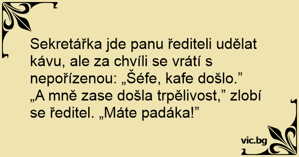 Sekretářka jde panu řediteli udělat kávu, ale za chvíli se vrátí s nepořízenou: „Šéfe, kafe došlo.”