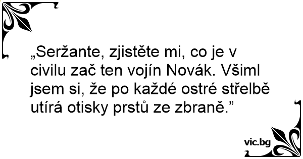„Seržante, zjistěte mi, co je v civilu zač ten vojín Novák. Všiml jsem si, že po každé ostré střelbě utírá otisky prstů ze zbraně.”