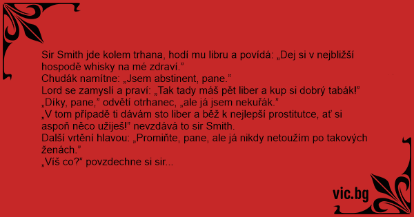 „Víš co?” povzdechne si sir Smith. „Tady máš dvě stě liber. Zajdi k mé ženě a řekni jí, ať se podívá, jak vypadá muž, který nepije, nekouří a nesmilní s prostitutkami!”