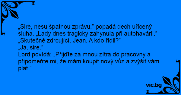 „Sire, nesu špatnou zprávu,” popadá dech uřícený sluha. „Lady dnes tragicky zahynula při autohavárii.”