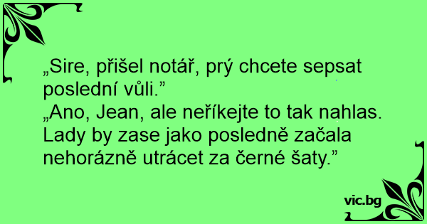 „Ano, Jean, ale neříkejte to tak nahlas. Lady by zase jako posledně začala nehorázně utrácet za černé šaty.”