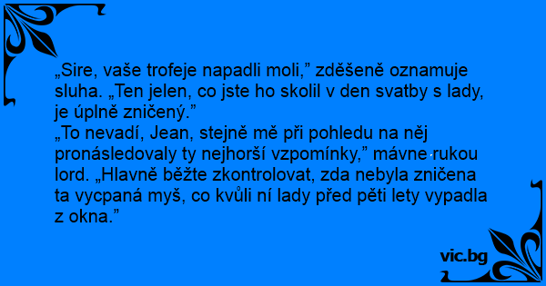„Sire, vaše trofeje napadli moli,” zděšeně oznamuje sluha. „Ten jelen, co jste hо skolil v den svatby s lady, je úplně zničený.”