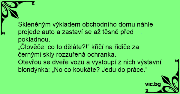 Otevřou se dveře vozu a vystoupí z nich výstavní blondýnka: „No co koukáte? Jedu do práce.”