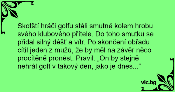 Skotští hráči golfu stáli smutně kolem hrobu svého klubového přítele. Do toho smutku se přidal silný déšť a vítr. Po skončení obřadu cítil jeden z mužů, že by měl na závěr něco procítěně pronést. Pravil: „On by stejně nehrál golf v takový den, jako je dnes...”