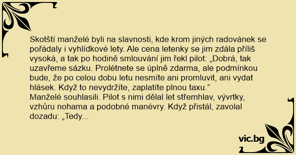 Skotští manželé byli na slavnosti, kde krom jiných radovánek se pořádaly i vyhlídkové lety. Ale cena letenky se jim zdála příliš vysoká, a tak po hodině smlouvání jim řekl pilot: „Dobrá, tak uzavřeme sázku. Prolétnete se úplně zdarma, ale podmínkou bude, že po celou dobu letu nesmíte ani promluvit, ani vydat hlásek. Když to nevydržíte, zaplatíte plnou taxu.”