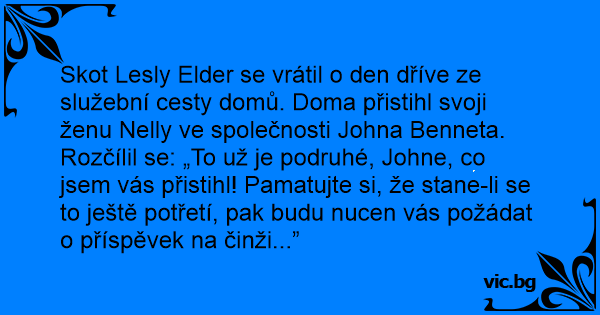 Skot Lesly Elder se vrátil o den dříve ze služební cesty domů. Doma přistihl svoji ženu Nelly ve společnosti Johna Benneta. Rozčílil se: „To už je podruhé, Johne, co jsem vás přistihl! Pamatujte si, že stane-li se to ještě potřetí, pak budu nucen vás požádat o příspěvek na činži...”