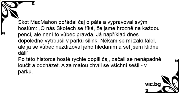 Skot MacMahon pořádal čaj o páté a vypravoval svým hostům: „O nás Skotech se říká, že jsme hrozně na každou penci, ale není to vůbec pravda. Já například dnes dopoledne vytrousil v parku šilink. Někam se mi zakutálel, ale já se vůbec nezdržoval jeho hledáním a šel jsem klidně dál!”