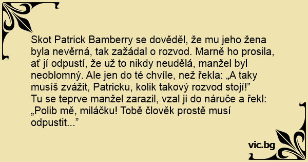 Skot Patrick Bamberry se dověděl, že mu jeho žena byla nevěrná, tak zažádal o rozvod. Marně hо prosila, ať jí odpustí, že už to nikdy neudělá, manžel byl neoblomný. Ale jen do té chvíle, než řekla: „A taky musíš zvážit, Patricku, kolik takový rozvod stojí!”