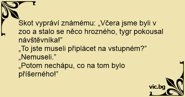 Skot vypráví známému: „Včera jsme byli v zoo a stalo se něco hrozného, tygr pokousal návštěvníka!”