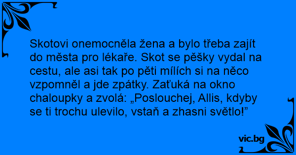 Skotovi onemocněla žena a bylo třeba zajít do města pro lékaře. Skot se pěšky vydal na cestu, ale asi tak po pěti mílích si na něco vzpomněl a jde zpátky. Zaťuká na okno chaloupky a zvolá: „Poslouchej, Allis, kdyby se ti trochu ulevilo, vstaň a zhasni světlo!”
