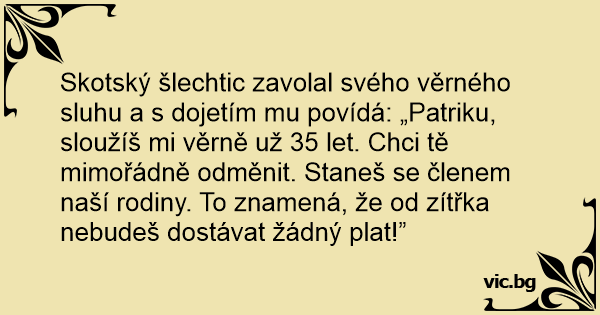 Skotský šlechtic zavolal svého věrného sluhu a s dojetím mu povídá: „Patriku, sloužíš mi věrně už 35 let. Chci tě mimořádně odměnit. Staneš se členem naší rodiny. To znamená, že od zítřka nebudeš dostávat žádný plat!”