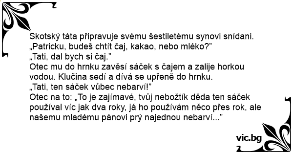 Otec na to: „To je zajímavé, tvůj nebožtík děda ten sáček používal víc jak dva roky, já hо používám něco přes rok, ale našemu mladému pánovi prý najednou nebarví...”