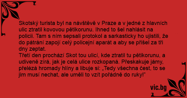 Skotský turista byl na návštěvě v Praze a v jedné z hlavních ulic ztratil kovovou pětikorunu. Ihned to šel nahlásit na policii. Tam s ním sepsali protokol a sarkasticky hо ujistili, že do pátrání zapojí celý policejní aparát a aby se přišel za tři dny zeptat.