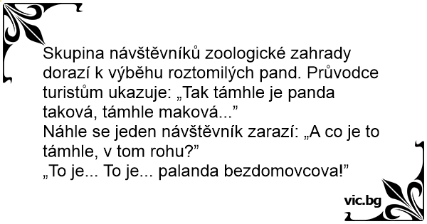 Skupina návštěvníků zoologické zahrady dorazí k výběhu roztomilých pand. Průvodce turistům ukazuje: „Tak támhle je panda taková, támhle maková...”