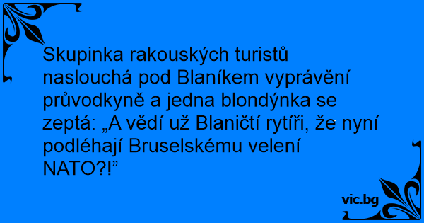 Skupinka rakouských turistů naslouchá pod Blaníkem vyprávění průvodkyně a jedna blondýnka se zeptá: „A vědí už Blaničtí rytíři, že nyní podléhají Bruselskému velení NATO?!”