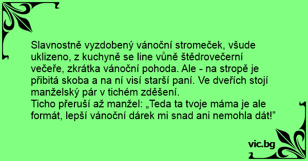 Slavnostně vyzdobený vánoční stromeček, všude uklizeno, z kuchyně se line vůně štědrovečerní večeře, zkrátka vánoční pohoda. Ale - na stropě je přibitá skoba a na ní visí starší paní. Ve dveřích stojí manželský pár v tichém zděšení.