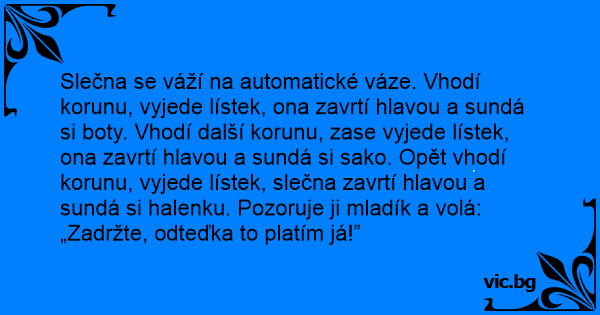 Slečna se váží na automatické váze. Vhodí korunu, vyjede lístek, ona zavrtí hlavou a sundá si boty. Vhodí další korunu, zase vyjede lístek, ona zavrtí hlavou a sundá si sako. Opět vhodí korunu, vyjede lístek, slečna zavrtí hlavou a sundá si halenku. Pozoruje ji mladík a volá: „Zadržte, odteďka to platím já!”