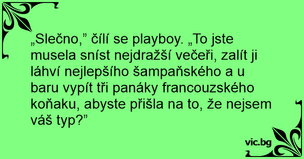 „Slečno,” čílí se рlаyвоy. „To jste musela sníst nejdražší večeři, zalít ji láhví nejlepšího šampaňského a u baru vypít tři panáky francouzského koňaku, abyste přišla na to, že nejsem váš typ?”