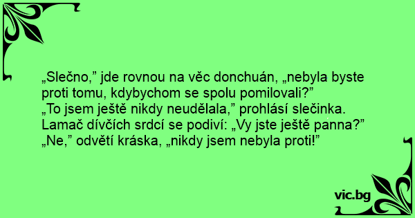 „Slečno,” jde rovnou na věc donchuán, „nebyla byste proti tomu, kdybychom se spolu pomilovali?”