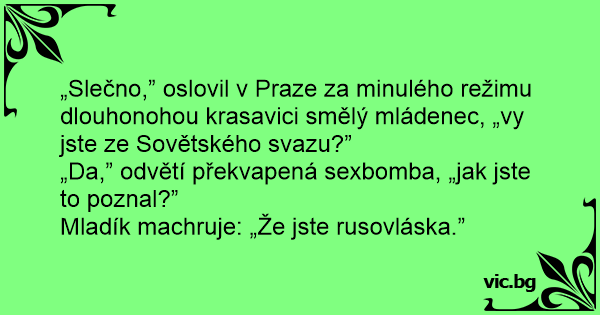 „Slečno,” oslovil v Praze za minulého režimu dlouhonohou krasavici smělý mládenec, „vy jste ze Sovětského svazu?”