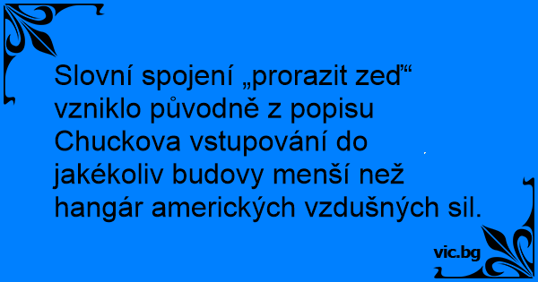 Slovní spojení „prorazit zeď“ vzniklo původně z popisu Chuckova vstupování do jakékoliv budovy menší než hangár amerických vzdušných sil.